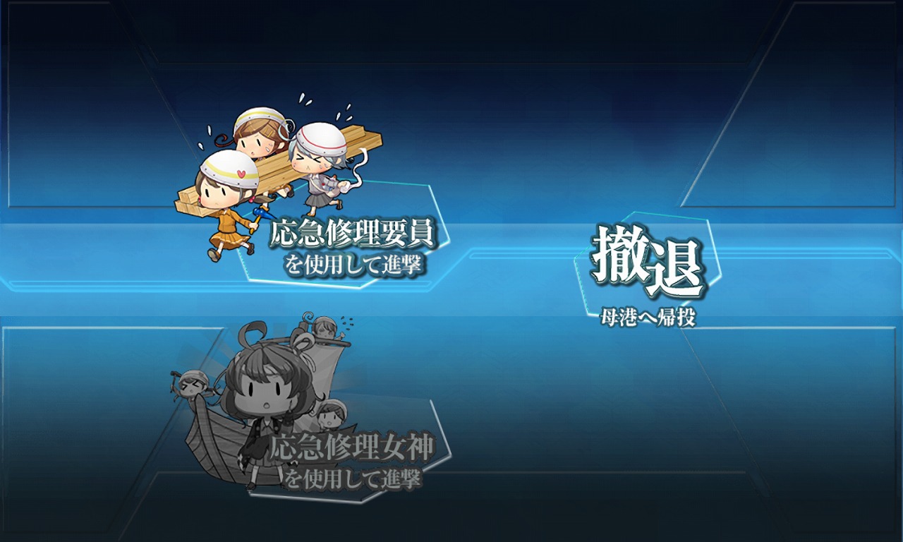 応急修理要員積んでたらこんな画面出るんですね知らなかったです…これ消費されるの?ってどきどきしながら進撃を選択しても消費されてませんでした。