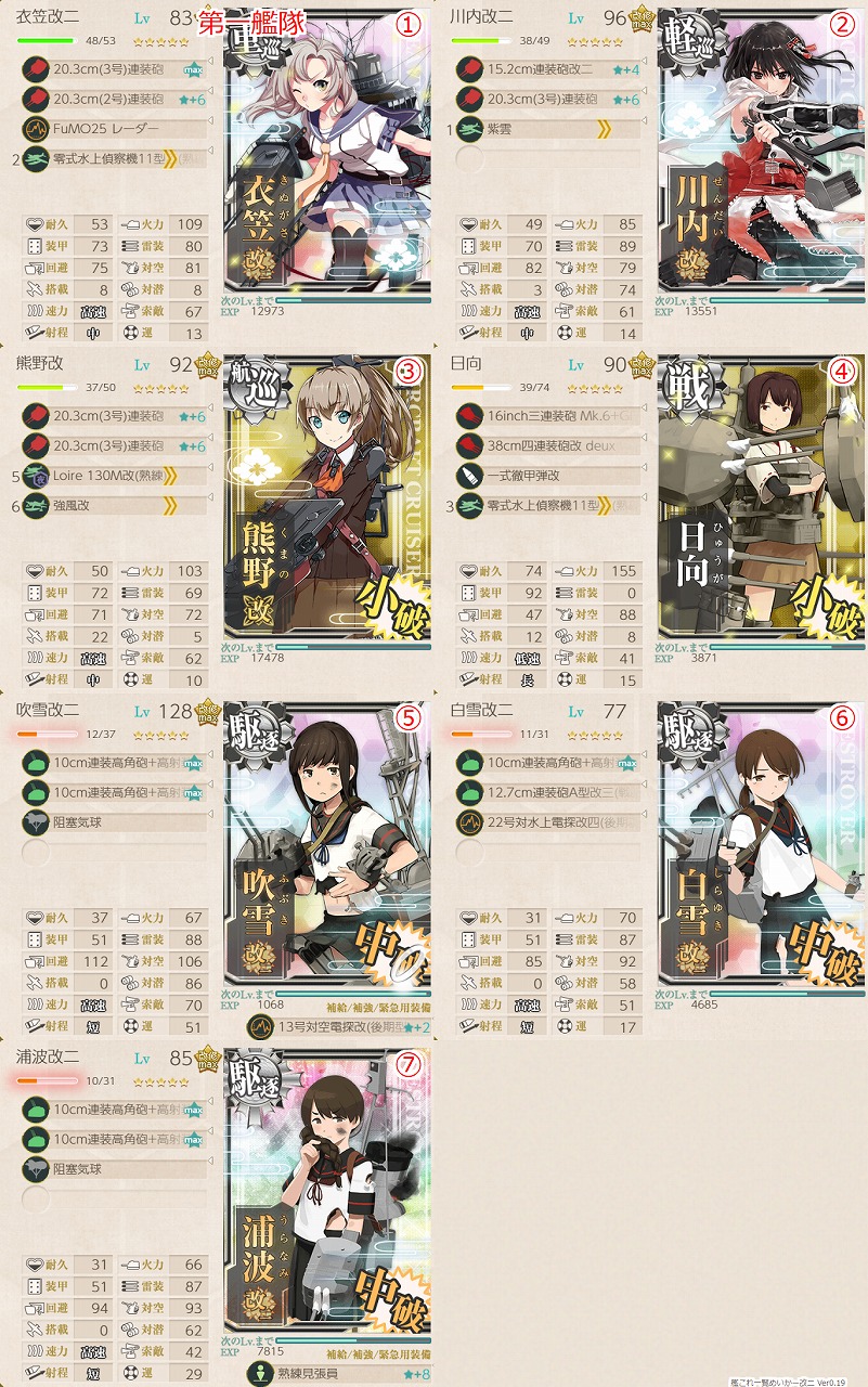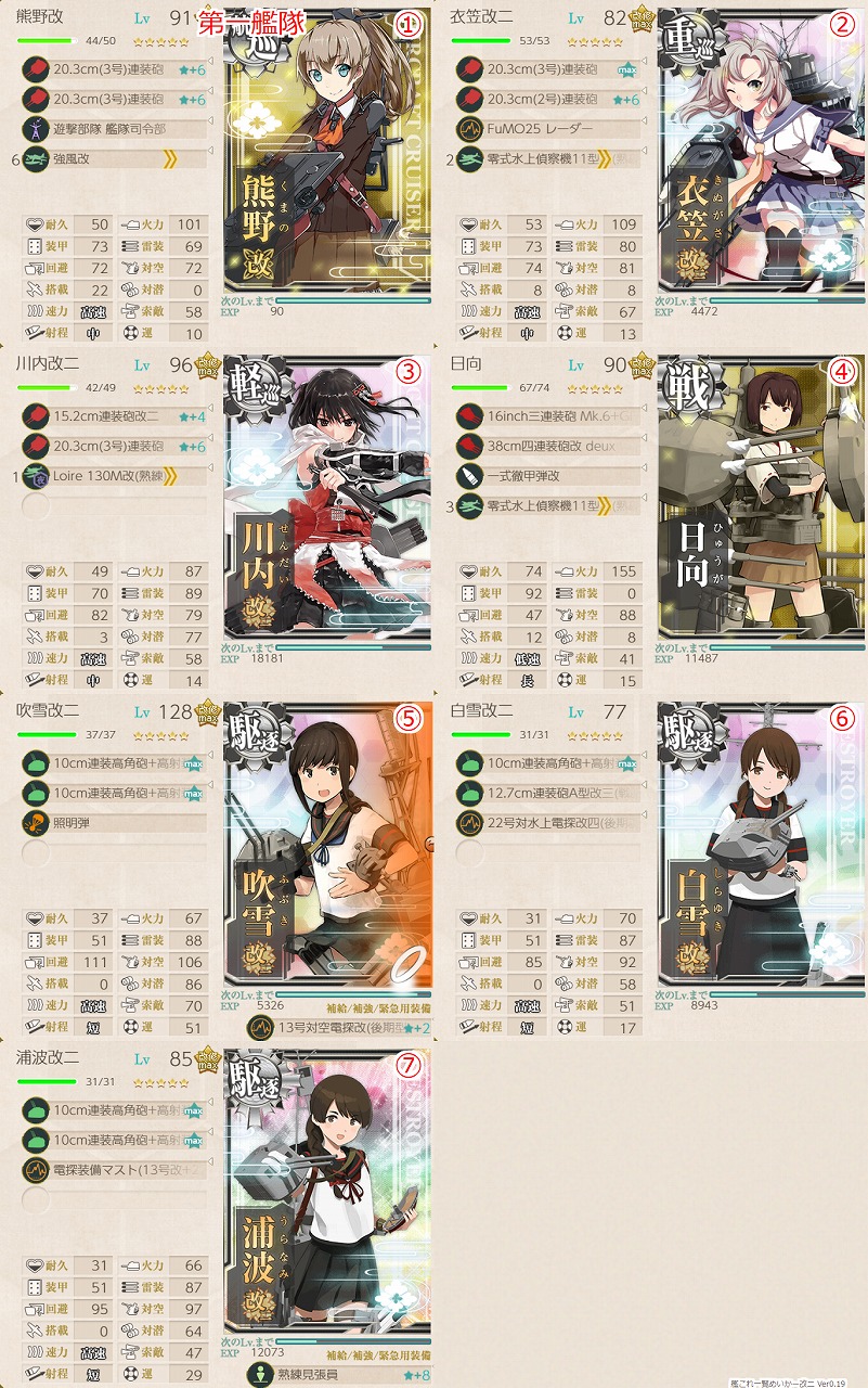 ボス攻略時の敵対空砲火苛烈すぎる。アークロイヤルか飛龍あたりの採用を考えましたが艦載機全滅率が50%超えてたので制空担当に熊野サブ。